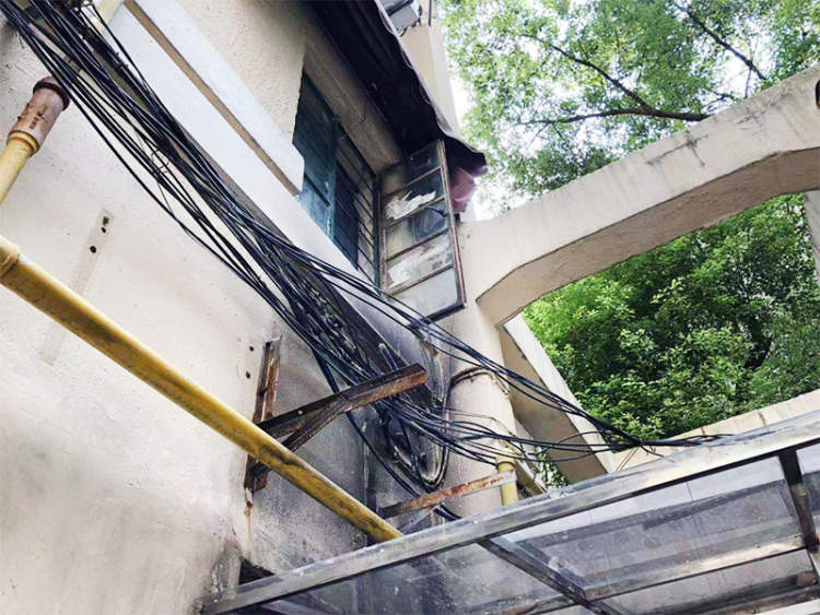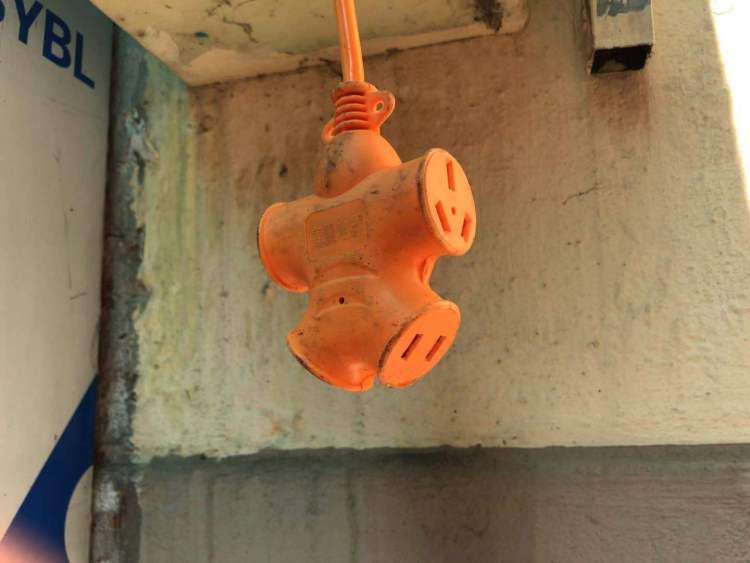 周到君在小区里看到,“飞线”现象十分普遍,每幢楼的门口都停有好几辆电瓶车,不少居民图省事就把充电线挂在室外,有的充电头甚至有四个插座,可以给四台电瓶车同时充电。