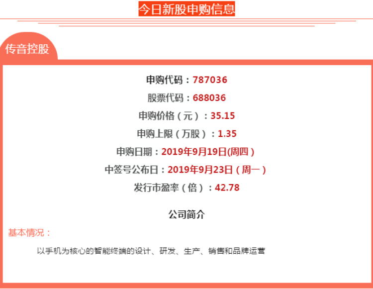 9月19日,科创板传音控股申购,申购代码“787036”,发行价35.15元,顶格申购需配市值13.5万元。2018年传音控股手机出货量1.24亿部,根据IDC统计数据,全球市场占有率达7.04%,排名第四。