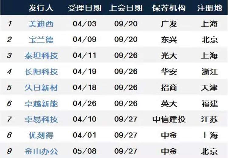 此外,本周五科创板上市委将审议美迪西和宝兰德的科创板首发上市申请。9月26日、27日两天将审议7家公司的上市申请:26日上午的长阳科技、泰坦科技,26日下午的久日新材、卓越新能,以及27日下午的金山办公、优刻得、卓易科技。这9家待审核科创公司的中三家注册在上海。