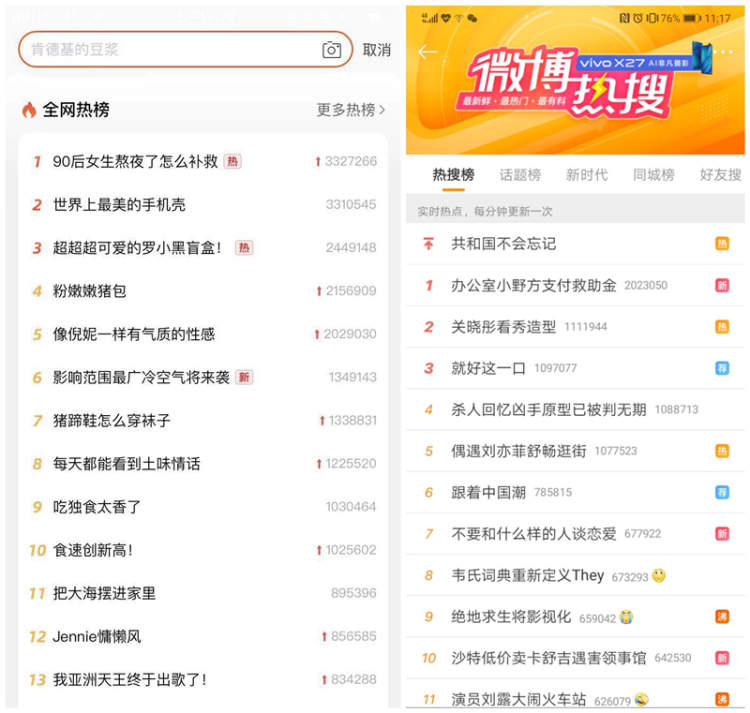 看到淘宝热搜全貌的周到君发现,它跟微博热搜榜相似度极高,也包含了热搜排名、热搜词条和实时热度指数。