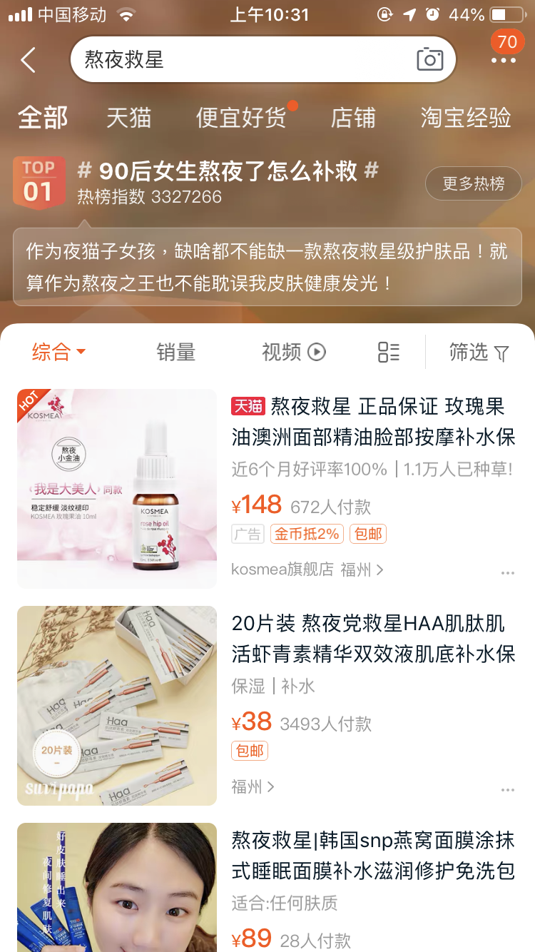 再具体看一看热搜内容,登榜第一的#90后女生熬夜了怎么补救#,周到君大胆猜测一定是各种熬夜救星“小黑瓶”、“小棕瓶”等等。