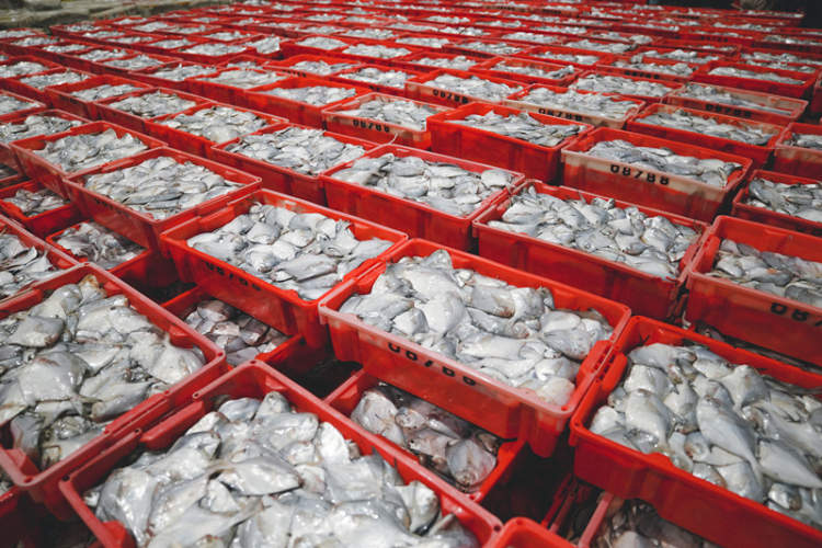 一个摊位上,上千箱带鱼被分成三层整齐地码放着,另一个摊位上,是同样整齐码放着的上千箱鲳鱼。