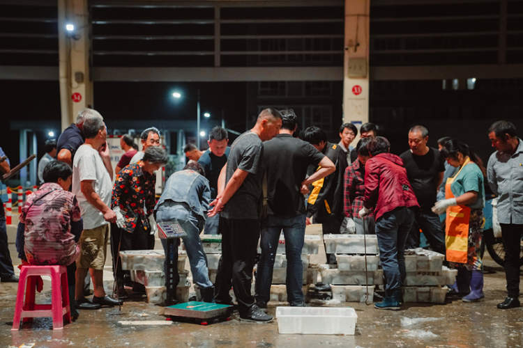 凌晨三点,石浦镇其他区域的街道上还很难见到一个人影,水产交易大厅已经是人声鼎沸。静候买主的卖家、货比三家的买家,穿着马甲、一刻不停的搬运工人,共同唤醒了沉睡的小镇。
