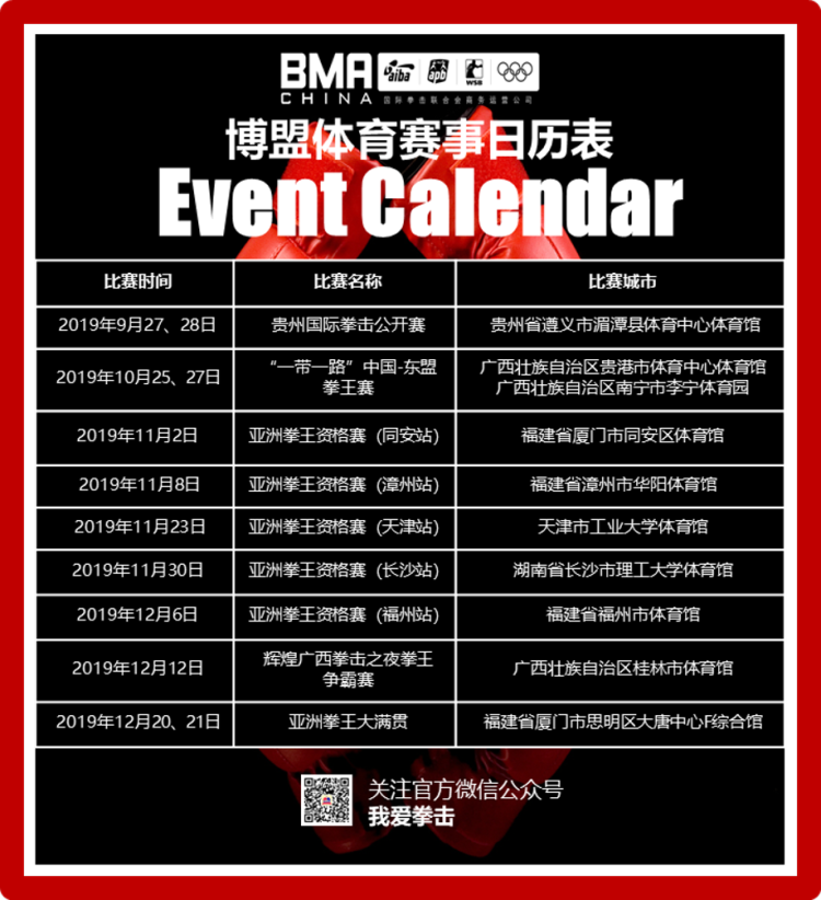 为期三个月的“2019博盟拳击季”有连续9项国际顶级拳击大赛不间断上演:分别是9月27日和28日在贵州省遵义市湄潭县体育中心体育馆举行的贵州国际拳击公开赛;10月25日和27日在广西壮族自治区贵港市体育中心体育馆及广西壮族自治区南宁市李宁体育园举行的“一带一路”中国-东盟拳王赛;11月2日至12月6日在福建厦门、福建漳州、天津、湖南长沙、福建福州等城市举行的五站亚洲拳王资格赛;12月12日在广西壮族自治区桂林市体育馆举行的辉煌广西拳击之夜拳王争霸赛暨桂林国际拳击公开赛;12月20日和21日在福建省厦门市思明区大唐中心F综合馆举行的亚洲拳王大满贯赛。