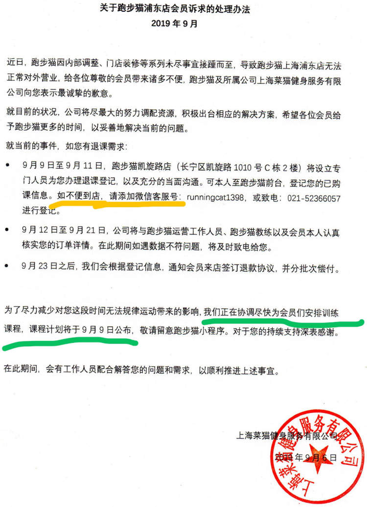 两家店关了,但公司位于长宁凯旋路1010号A座7楼的办公场所开门运营。上海菜猫健康管理有限公司(跑步猫总公司)一位员工出面回应,公司资金链出了问题,欠教练5个多月工资未付,教练停工导致健身房停业,会员纷纷要求退费,现在正在登记、核对相关信息,9月23日后会陆续处理。