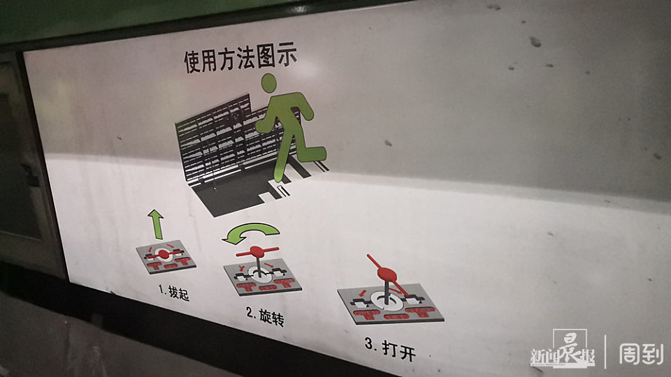 墙壁上醒目地标示着使用方法图示:拔起(开关)——旋转——(自动)打开。乘客只要旋转拉手,往上一提,大门便会自动打开,因为井盖下方安装了助力气泵。