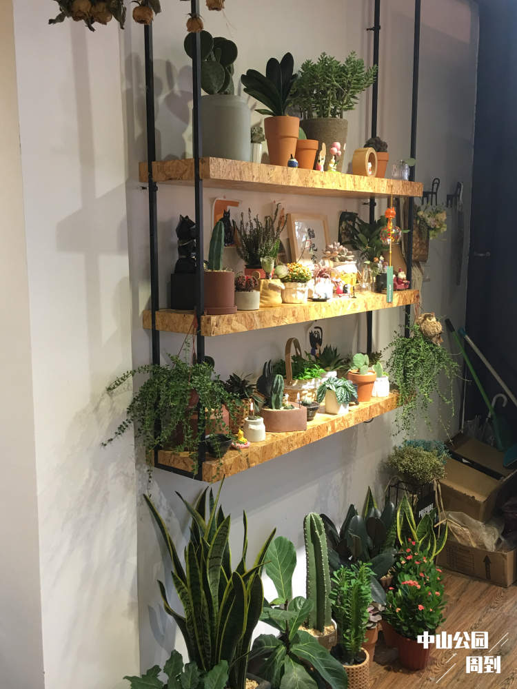 大幅落地玻璃窗,一眼就能看见店内全貌:一束束插在玻璃花瓶里的花,架子上摆放整齐的各式盆栽,混搭一些清新可爱的小元素……