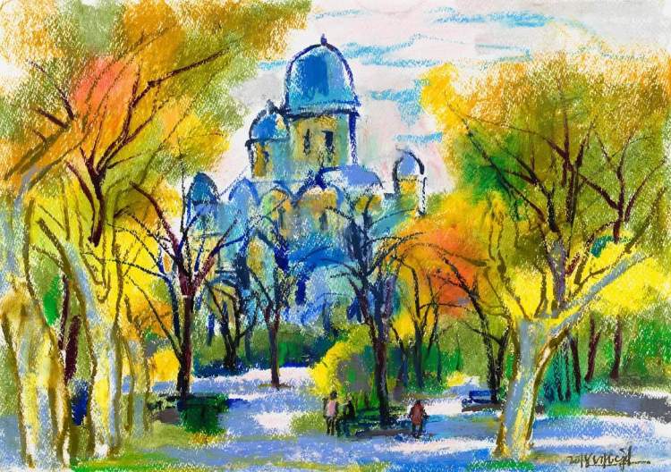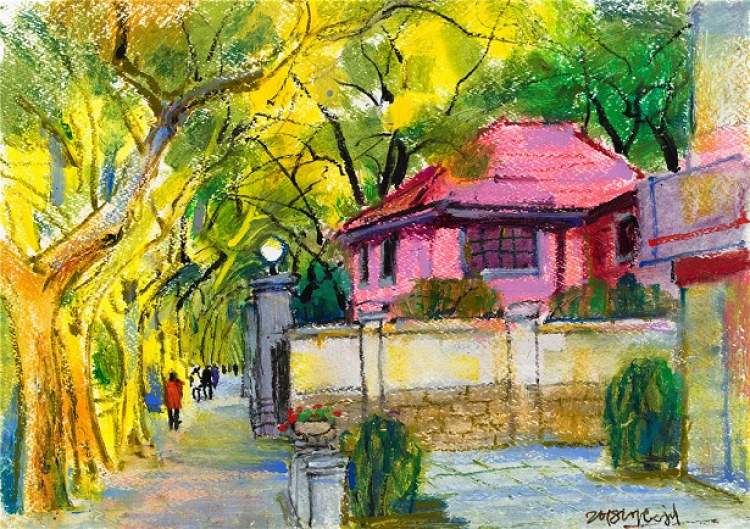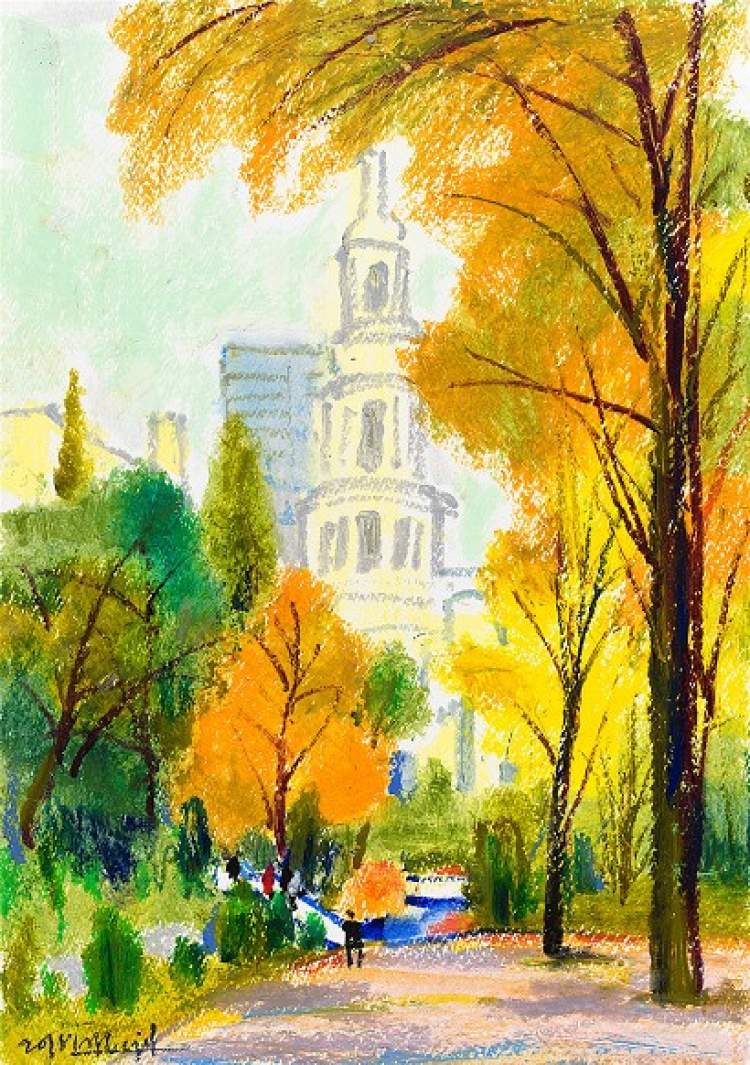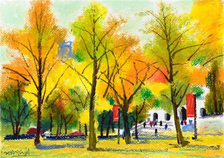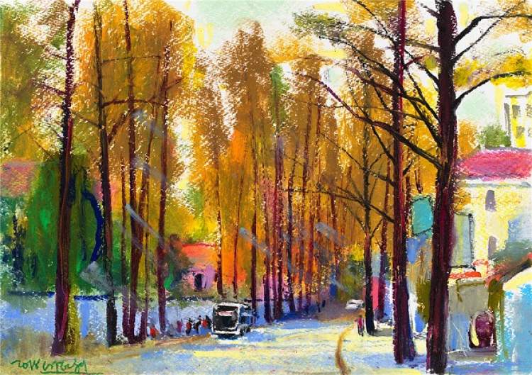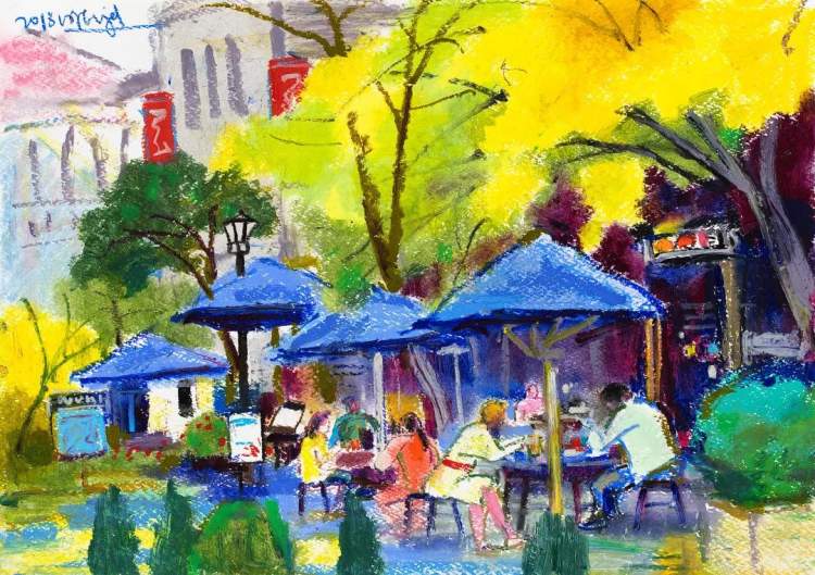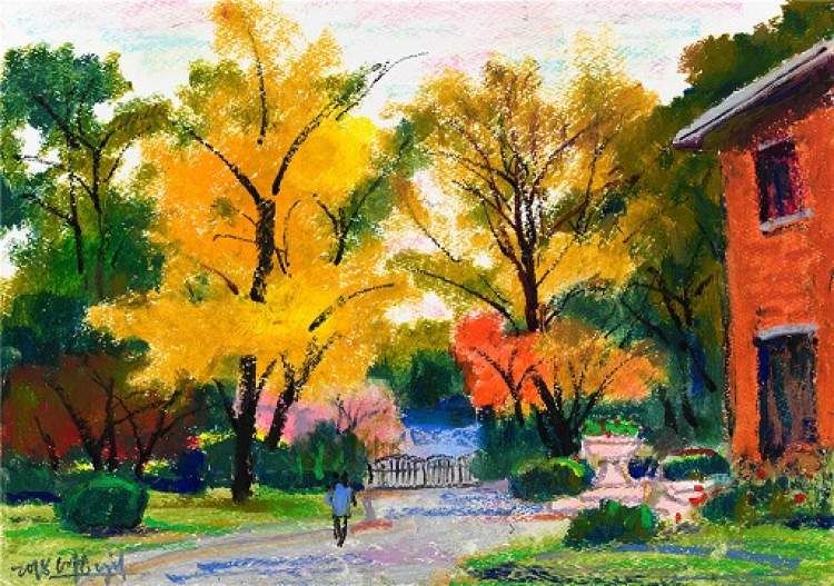 他画笔下的秋日都市,有着沉淀百年且优雅至极的气质。他以寥寥数笔所呈现的严谨结构、饱满色彩、自由线条,使优雅和教养跃然纸上。