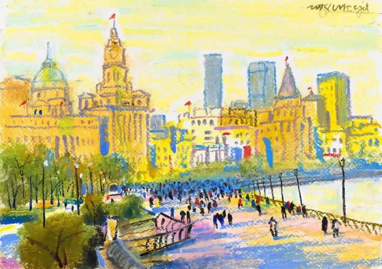 丁西林认为,陈钧德手里的笔、颜料和力量,只忠实于自己的内心。他践行了王国维所言:一切景语皆情语。此次他创作的三十多幅纸本油画,都围绕“海上秋韵”主题,让大家“眼”熟能详的都市景观焕发出奇异的光芒。