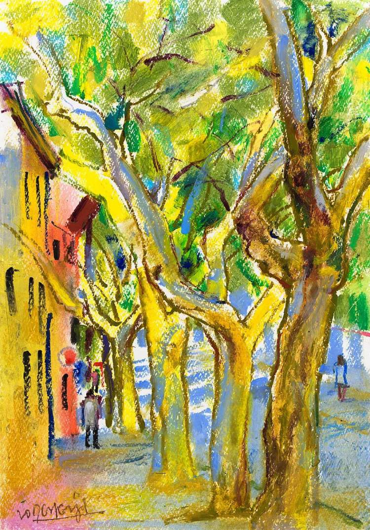 陈钧德先生认为,上海的梧桐,其实与巴黎、马赛、里昂等法国城市的不同,与中国南京、杭州的也不同。陈钧德每每在上海西区小路游荡,梧桐总是首先抓获了他的视线,令他百看不腻。风姿绰约的上海梧桐,神奇地将周遭的高楼、洋房、弄堂、汽车、居民,融化为一种优雅和宁静的调性。因而在他的画笔下,梧桐成为了现代上海的精灵,由于梧桐树的联系,四周的一切方显楚楚动人。