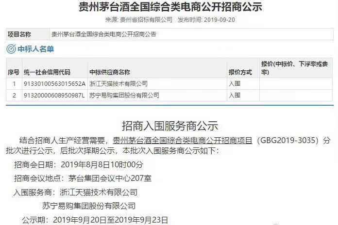 实际上,今天是茅台酒全国综合类电商公开招商项目公示结果的日子,公示表明,最终是天猫与苏宁易购双双中标。