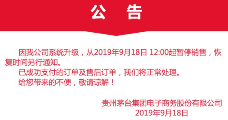 在线上平台,茅台商城于9月18日发布公告,表示因系统升级将暂停销售,恢复时间另行通知。