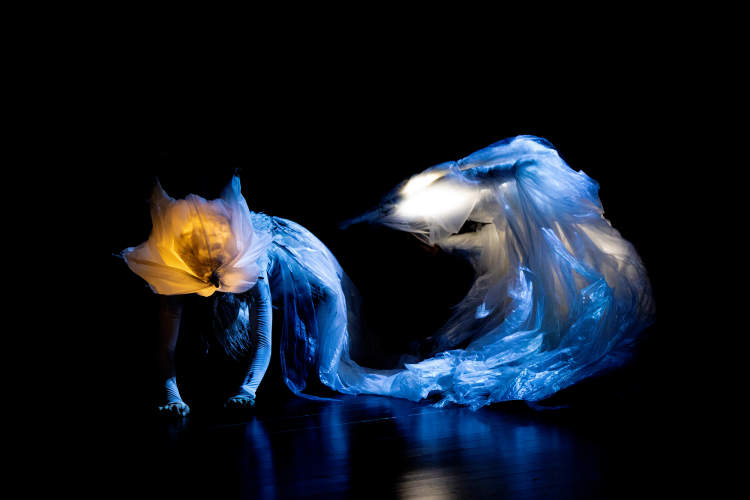 九尾狐的华服由废弃布料制成,大禹与垃圾袋制成的龙缠斗,伏羲推出一个废旧的铁桶、用手电一照、星空充斥整个剧场……