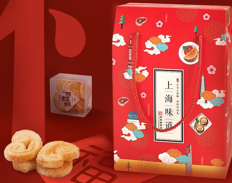 其中,“上海味道”礼盒清单包括小蝴蝶酥、咸味松仁酥、巧克力拉花、美国杏桃酥,“金玉满堂”礼盒包括小蝴蝶酥、巧克力拉花、夏威夷坚果、美国杏桃酥、胡桃排、杏桃排。