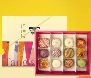 没有老字号的包袱,唐饼家在用材和形象上都能自由发挥。口味有抹茶、南瓜、冰沙、紫薯等,材料有核桃、红薯、芋头、日本海藻糖、抹茶粉、巧克力酱、南瓜、新西兰奶油、火龙果等,蛋黄酥的外观犹如梵高的星空,深受年轻人的欢迎。