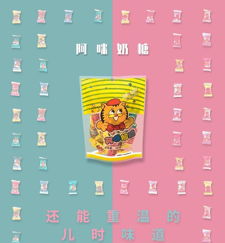 阿咪始于1941年,生产的奶糖盛行于90年代,造型各异的猫咪、色彩鲜艳的糖纸是80后的美好记忆。最酷的是,它早在90年代就提出了少糖的理念,将奶糖的糖度降至国内糖果的最低水平,让父母也更愿意为孩子买单。