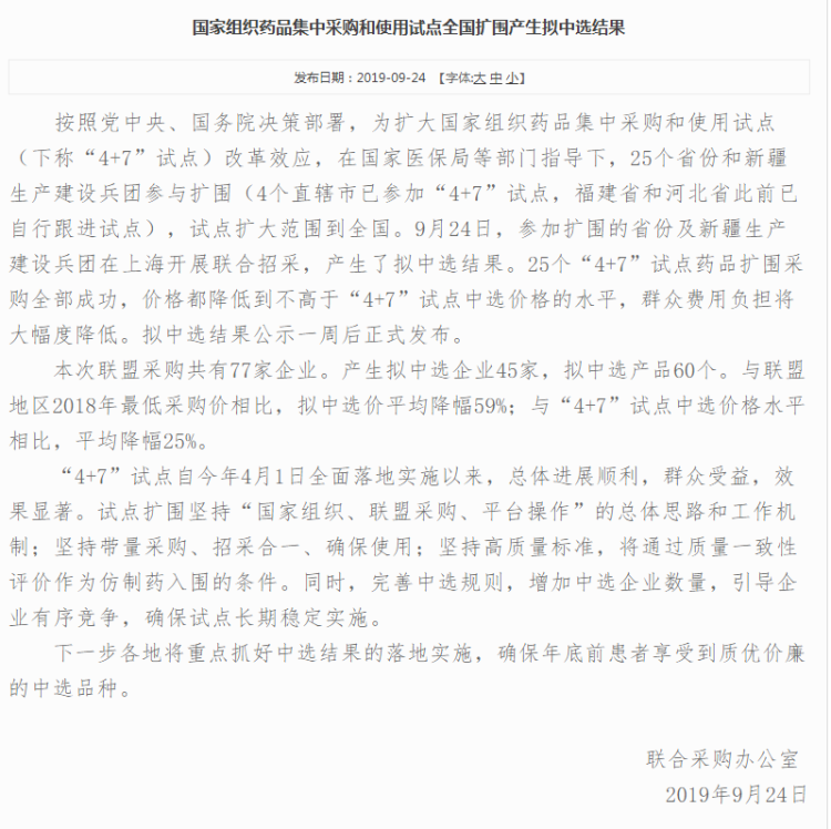 本次联盟采购共有77家企业,产生拟中选企业45家,拟中选产品60个。与联盟地区2018年最低采购价相比,拟中选价平均降幅59%;与“4+7”试点中选价格水平相比,平均降幅25%。