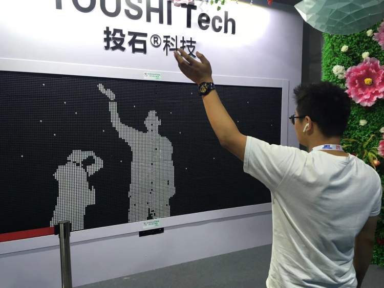 投石科技带来的磁力翻转屏,让黑白的小磁片根据观者的身形变化而翻转出你投影的样子。