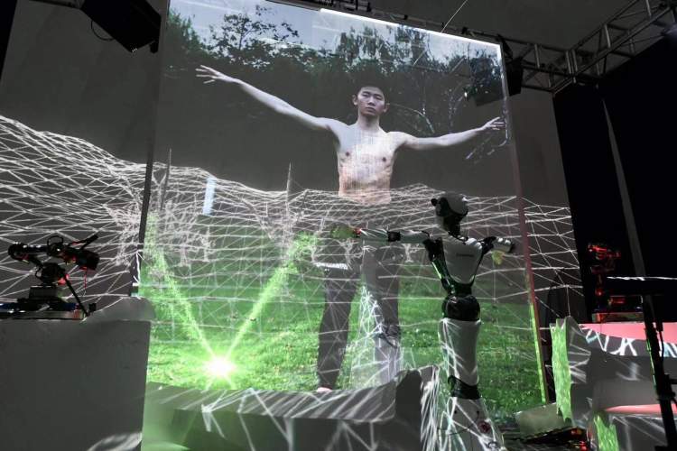 这是一件多媒体装置艺术作品。投影里的人跟着现场的机器人学习武术,机器臂也在创作一件跟树枝有关的艺术作品。