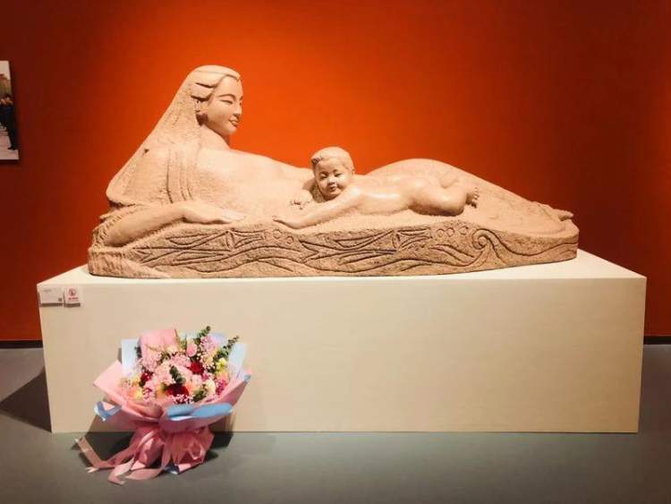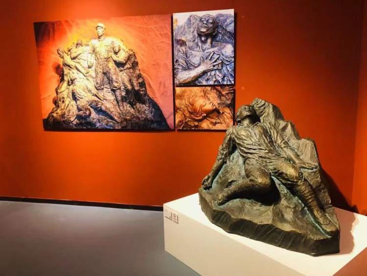 中国工农红军西路军英勇奋战、血战祁连的悲壮历程在本次主题雕塑展中可以找到答案,《血祭祁连》雕塑正中,一位老战士拖着牺牲的小战士,右段战士们激战祁连山下,左段三本书寓意西路军瞑目长眠与中国革命正史。