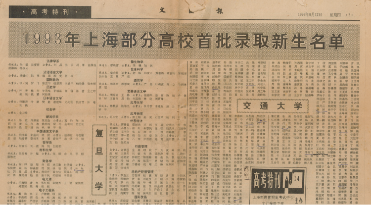 在岁月的浸润下,报纸的纸张已经变得像古书般泛黄,尤其折起处还有几处缺角。突然第七版的“1993年上海部分高校首批录取新生名单”映入了我的眼帘。在交大一栏里,我发现有几个名字被划上了线,还有一个加粗了呢。定睛一看,这不是我爸的名字嘛!