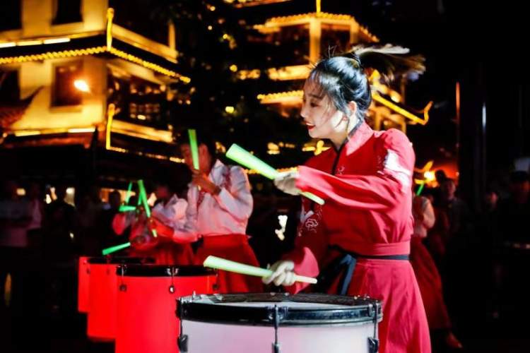 在豫园中心广场,每晚19:00、20:00、21:00三个时段都会演绎名为“花开月正圆 豫夜东方潮”的3D投影鼓秀,一段激情澎湃的鼓舞表演之后,豫园商城的和丰楼会成为一面巨型的投影墙,为现场的市民、游客带来精彩的光影演出。