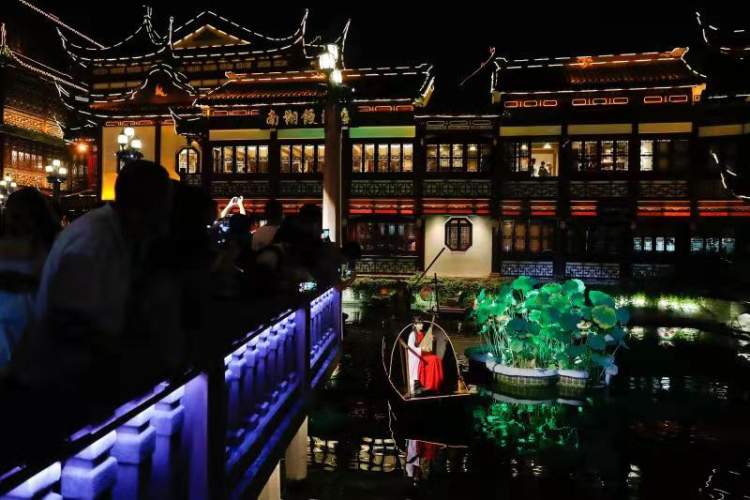 每晚19:15、20:15、21:15三个时段,九曲桥湖面都会成为一个大型光影场景,通过湖面乌篷船的穿梭和表演者的现场演艺,充分演绎江南文化,再现上海故里魅力。