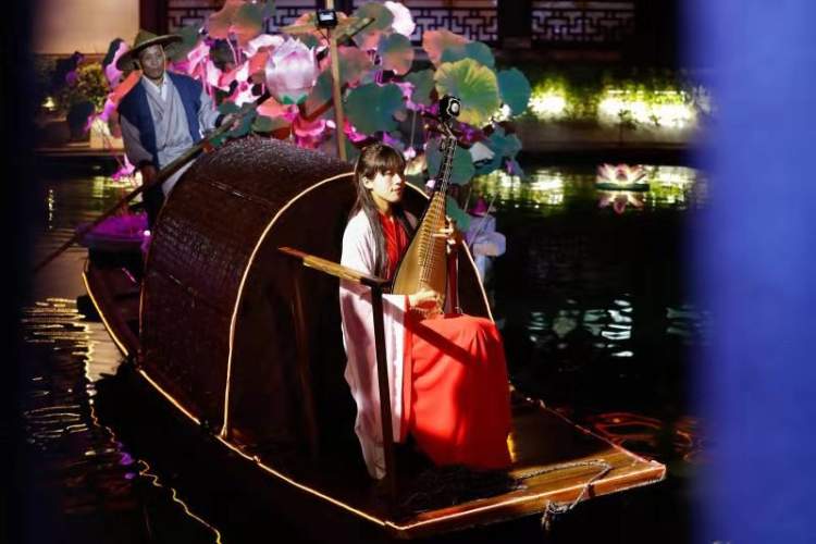 融汇中西文化的文艺演出“豫见奇妙夜”演艺活动中,九曲桥的“邂逅·时光”水景船秀是一大亮点。
