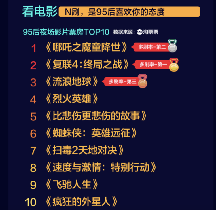 淘票票数据显示,2019年1月以来,95后“N刷”最多的影片依次是《复仇者联盟4:终局之战》《哪吒之魔童降世》《流浪地球》。