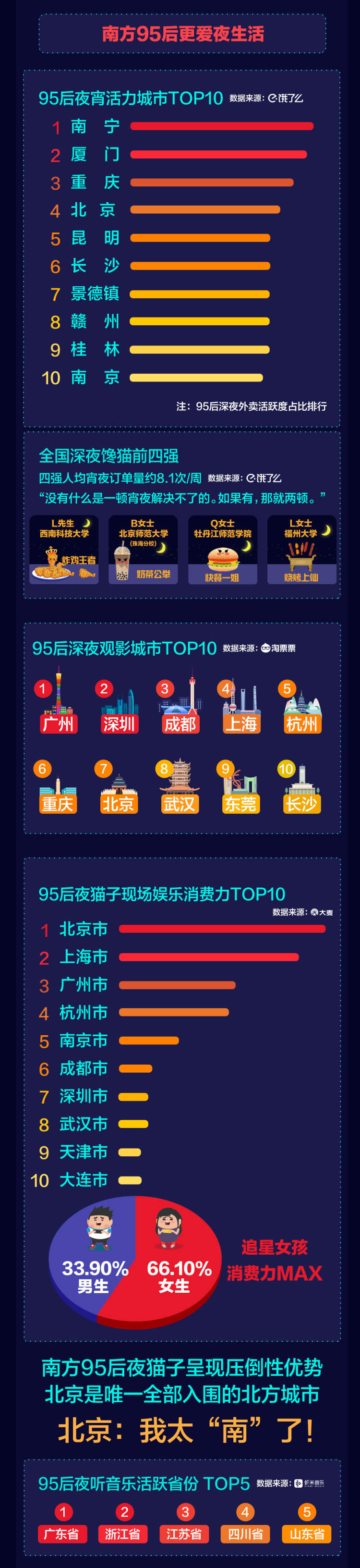 《95后夜猫子报告》综合数据显示,无论是观影、追星、听音乐,还是吃宵夜,南方95后夜猫子的活跃度都呈现压倒性优势。