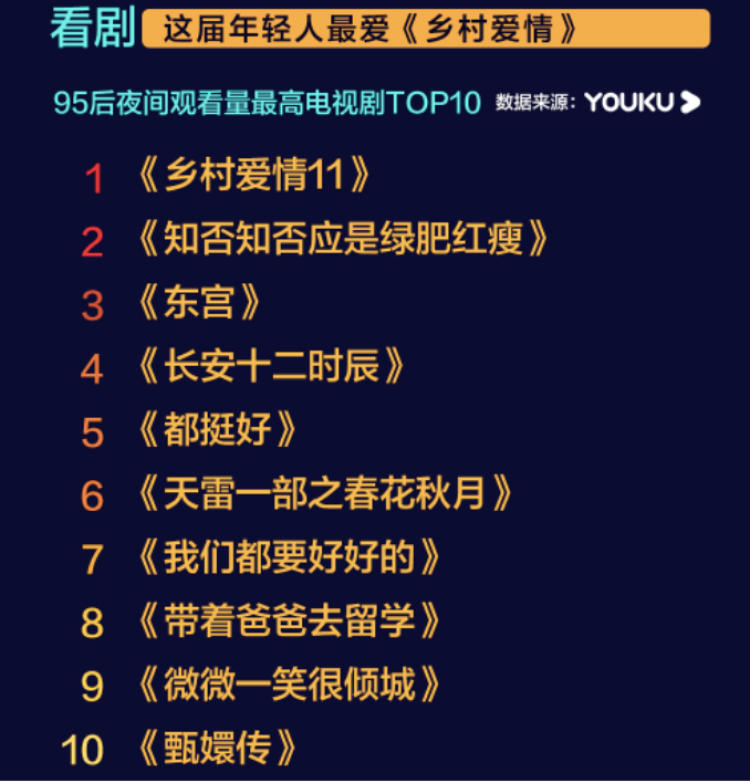 优酷数据显示,2019年,95后年轻人夜间观看量最高电视剧第一名是《乡村爱情11》!