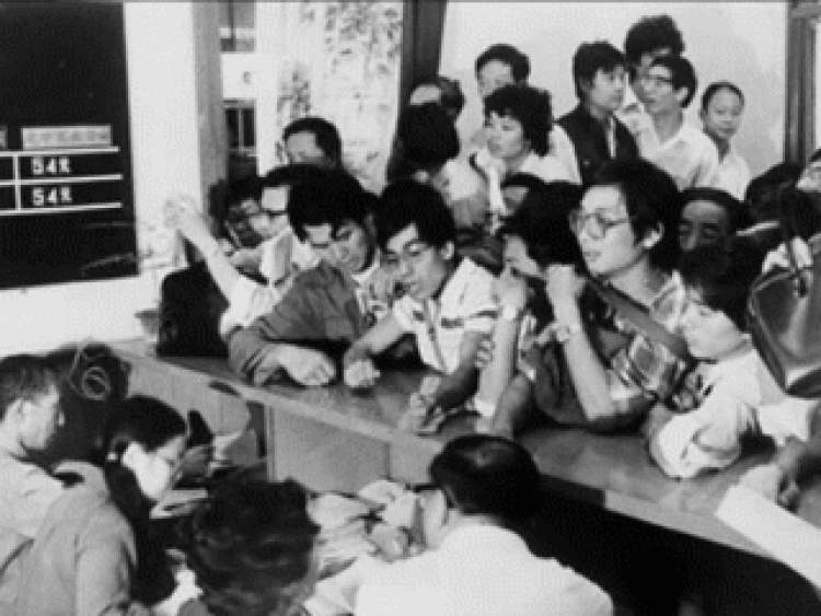 1986年9月,中国工商银行上海分行信托投资公司静安营业部开设交易柜台,新中国第一次出现了股票的店头交易。照片中是市民们争相在柜台前交易股票。