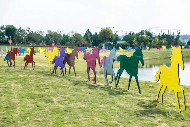 70匹单马雕塑沿湖一字排开,在头马的引领下,群马呈现飞奔之姿、气势雄伟……今天下午,由闵行区政协主办的《万马奔腾》雕塑揭幕、“心连星”共绘小龙马、“故纸兴味·书香传志”古籍藏书展等系列活动在闵行文化公园举行。