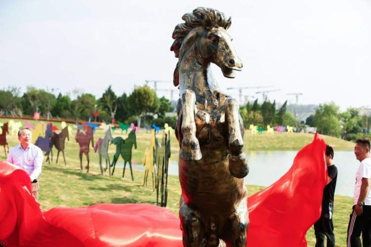 活动的第一部分是《万马奔腾》群体雕塑揭幕式,该群雕由闵行区政协委员、跨界艺术家马兴文先生设计打造,旨在将马的文化精神注入闵行,寓意着一马当先、勇往直前、不断奔跑的奋斗精神。
