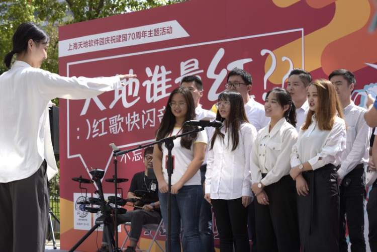 为庆祝新中国成立70周年,今天(9月27日)一场以“乐队入驻”、“露天音乐会”、“红歌”、“快闪”为形式,集“青春、爱国、传承、奋进”于一体的“红歌快闪音乐会”,在上海天地软件园879弄的中心花园举行。
