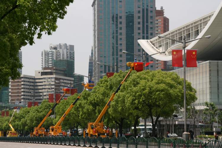 ■每逢国庆前,国网上海电力都会为人民大道两旁的路灯杆挂上国旗