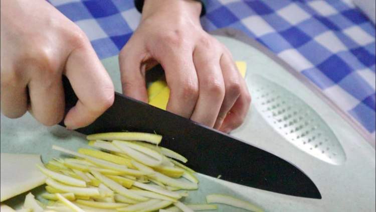 2.用刀将最外面那层黄色的皮削下来,尽量薄一些,再将柚子皮切成细丝,越细越好。
