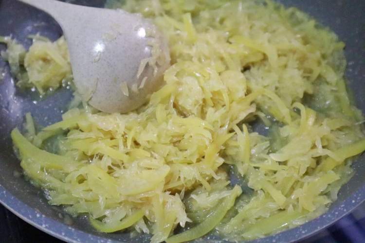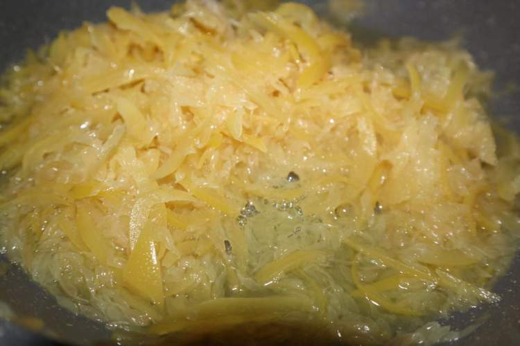 然后将切丝后的柚子皮先放入水中煮一下,再捞出备用。这样处理过就会大大减少苦味哦!