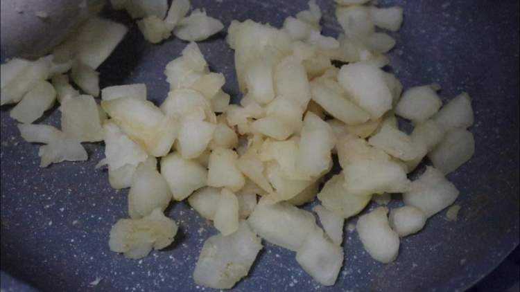 3.锅中加少量水,放入冰糖,待冰糖溶化后放入白瓤搅拌,这同样需要耐心!