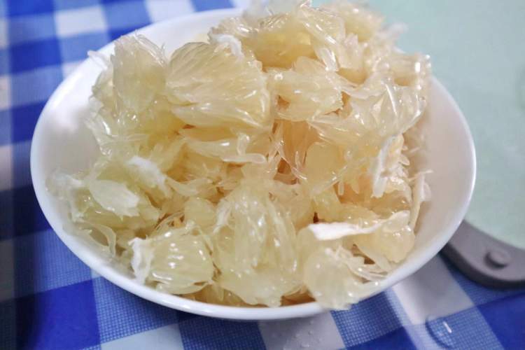 1.柚子皮削掉外皮和最里面的筋络,剩下的白瓤切小块,用盐水冲泡几次后挤干水分。