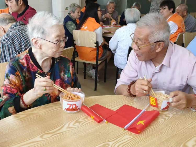 志愿者们将一碗碗富有创意和爱心的“国庆面”端上餐桌,并为老人们递上了筷子。
