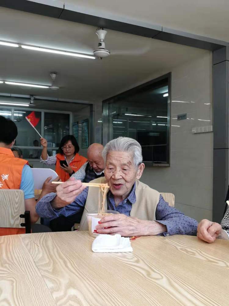 “面很好吃,味道酸酸甜甜的,我牙口不好,也能吃得动。”99岁的老人沈杏囡说,这是她第一次吃国庆面,看起来很简单的一碗面,味道却很丰富。