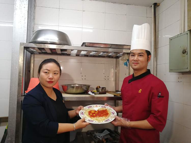 “这碗‘国庆面’真好吃,祝祖国70岁生日快乐!”家住延长小区的90岁爱国华侨吴瑞严说。这碗面做成了爱心形状,上面用番茄酱和鸡蛋饼做成了一面国旗的模样,是厨师特意为欢贺祖国70周年研发,因此被称为“国庆面”。