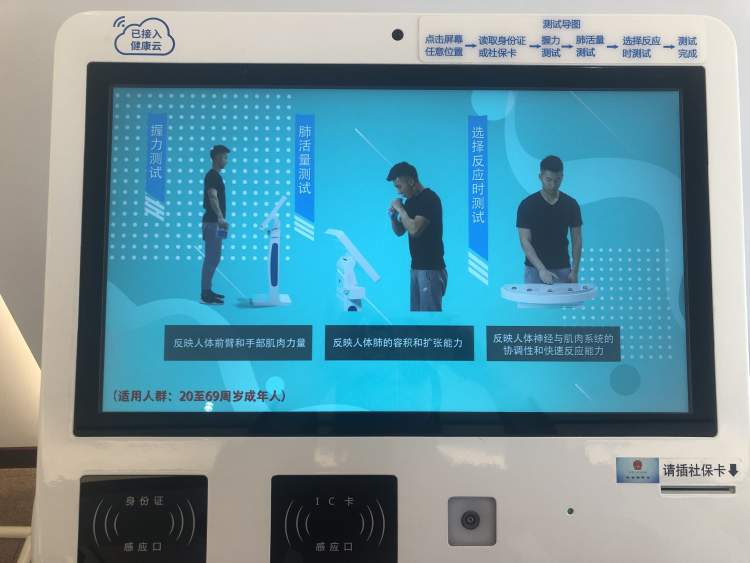 除了“健康一体机”,还设有体质检测区,可根据系统语音提示,完成肺活量、握力、纵跳、坐位体前屈、台阶等体质检测。