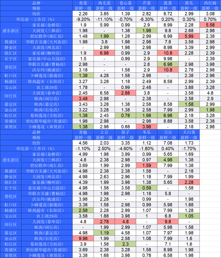 ■粉底标注代表该蔬菜品种在上述农贸市场或超市的最高价;绿底标注代表该蔬菜品种在上述农贸市场或超市的最低价