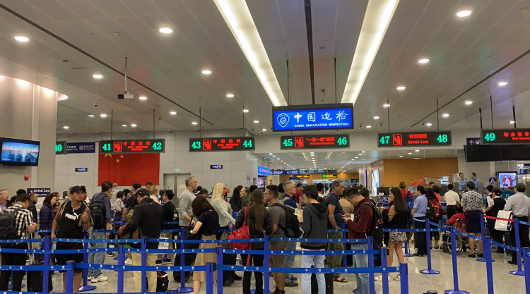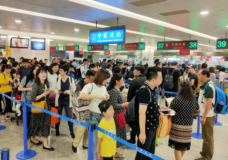 9月30日上午10时,记者在浦东机场2号航站楼边检出境大厅看到,排队办理出境边检手续的旅客络绎不绝,在边检工作人员的引导下有序分流候检,现场秩序井然,旅客通关顺畅。