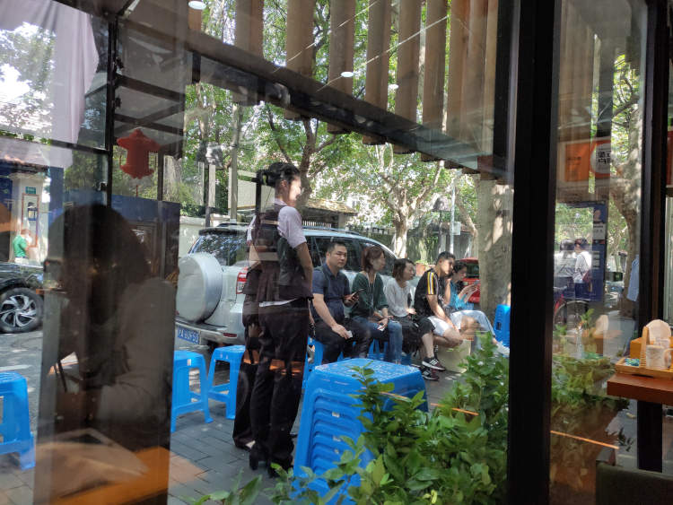 蟹尊苑(巨庐店)位于巨鹿路889弄21号,共有三层楼。这家店于每天中午11点整开始营业,到11点半左右店门口排队的架势就已经是这样了↓