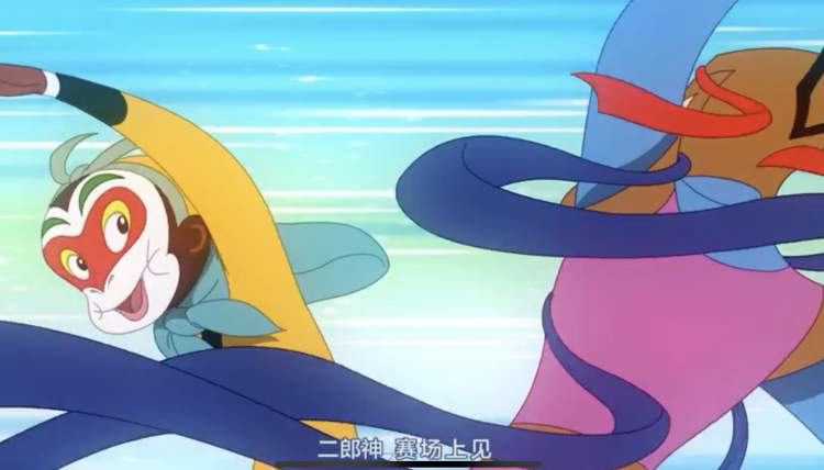 短片中,彩色动画长片《大闹天宫》中大战不休的孙悟空、二郎神,在赛场上相逢一笑冰释前嫌;