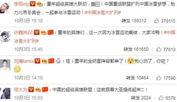 不少明星也加入了粉丝队伍,纷纷为中国动画联盟点赞,为2022北京冬奥会加油助威↓