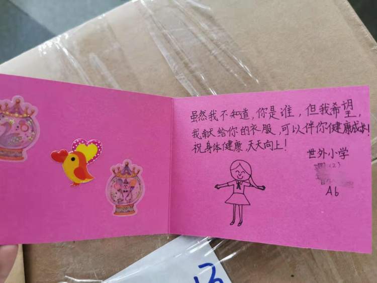 10月5日,徐汇区爱菊小学捐赠的校服被纸箱严密打包,细心的师生们还用红纸标贴箱内所装的衣物清单。宝山中环实验学校、世外中学也陆续有老师、学生送来校服。